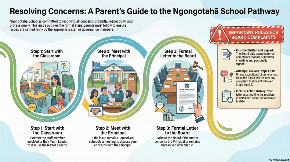 At Ngongotahā School, we are committed to maintaining a safe, inclusive, and supportive environment for our entire community. We aim to address all concerns and incidents promptly, respectfully, and professionally to reach a positive resolution for everyone involved.